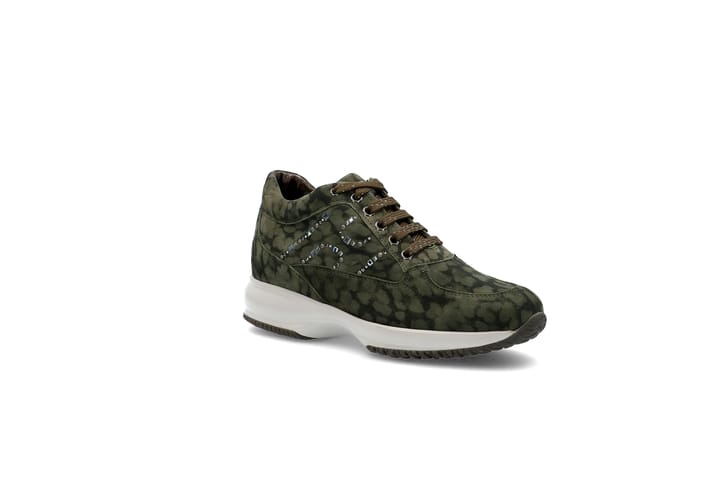 Hogan Interactive sneaker i grønt leopardmønster i skinn. Laget i Italia. Interactive-modellen fra Hogan er stor i størrelsen. Vi anbefaler å velge 1,5 størrelse mindre enn det du normalt bruker.