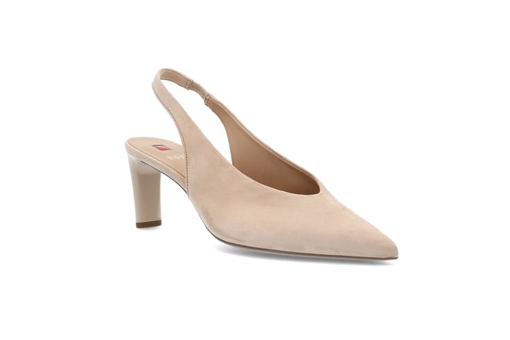 Elegant slingback pump fra Högl i beige, semsket skinn. Spiss tå og elastikk i hæl-remmen. Hælhøyde 70 mm.