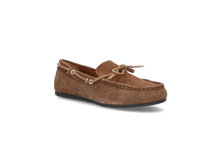 Håndlagede loafers i brunt, semsket skinn, med skinnsnøring. Båtskoen har en tradisjonell mokasin-konstruksjon, med håndsydde detaljer. Gullfargede maljer og en fleksibel gummisåle.